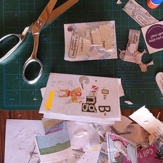 [4] Alt text for zine-making in progress: Left: A hand holds down the cover of the Dear Fearless Writer zine, with scraps of paper glued to the cover and more scraps and cut-out speech bubbles on the surface surrounding the zine. Middle: Hand holding open the Dear Fearless Writer zine, showing a torn image of a person's mouth and chin with hands folded up under the chin, and cut-out speech bubbles. Right: both zines side by side, surrounded by scissors, glue stick, stickers, and many paper scraps.